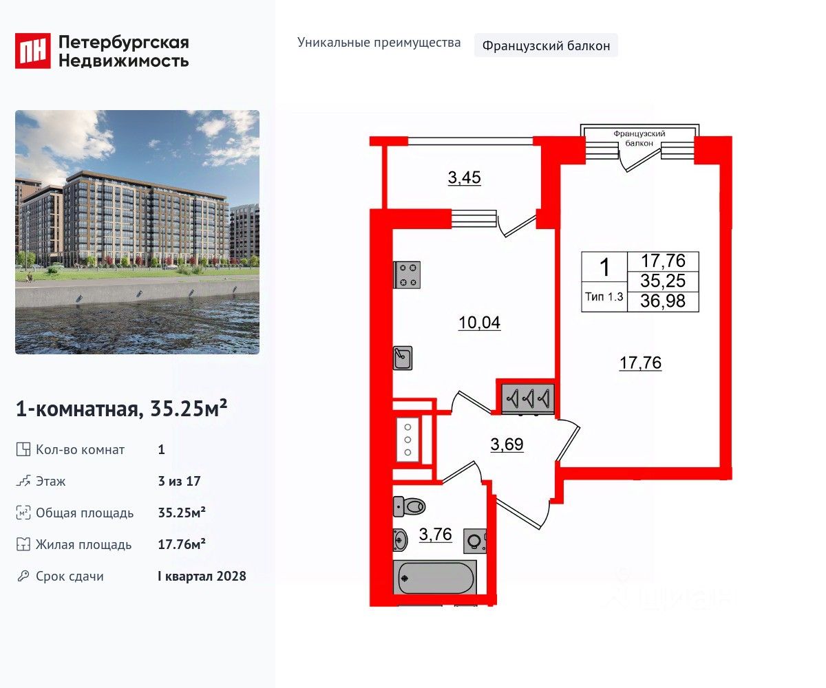 Уникальная планировка, кухня 10.04 м², вместительная прихожая 3.69 м². Общая площадь квартиры - 35.25 м², жилая 17.76 м², высота потолка 2.77 м.