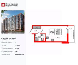 Удобная, классическая, функциональная европланировка, вместительная прихожая 3.02 м². Общая площадь студии - 24.03 м², жилая 18 м², высота потолка 3 м.