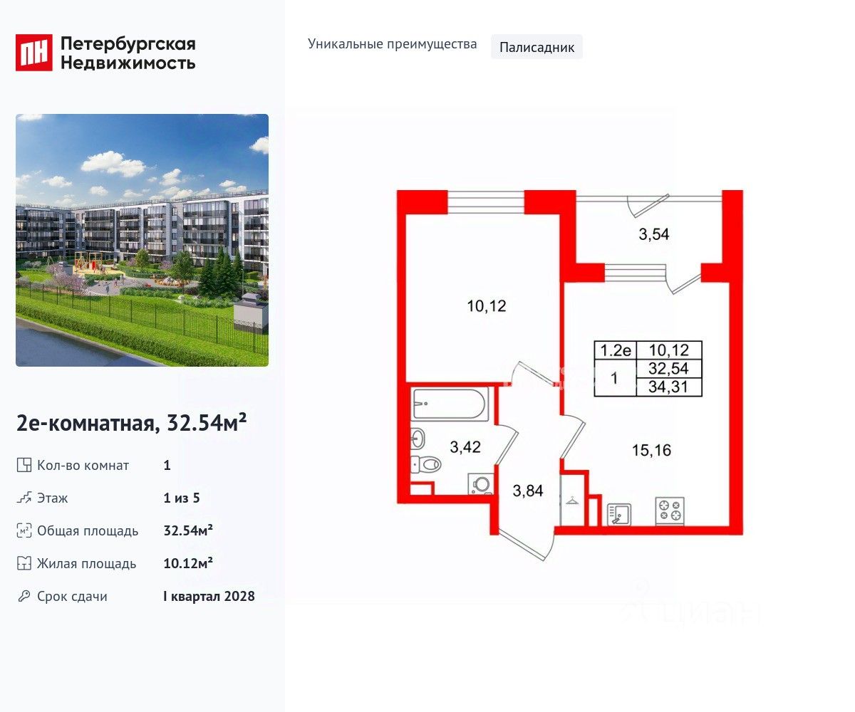 Уникальная, функциональная европланировка, большая кухня-гостиная 15.16 м², вместительная прихожая 3.84 м². Общая площадь квартиры - 32.54 м², жилая 10.12 м², высота потолка 2.77 м.