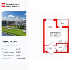 Удобная, классическая, функциональная европланировка, вместительная прихожая 3.07 м². Общая площадь студии - 24.53 м², жилая 18.08 м², высота потолка 2.77 м.
