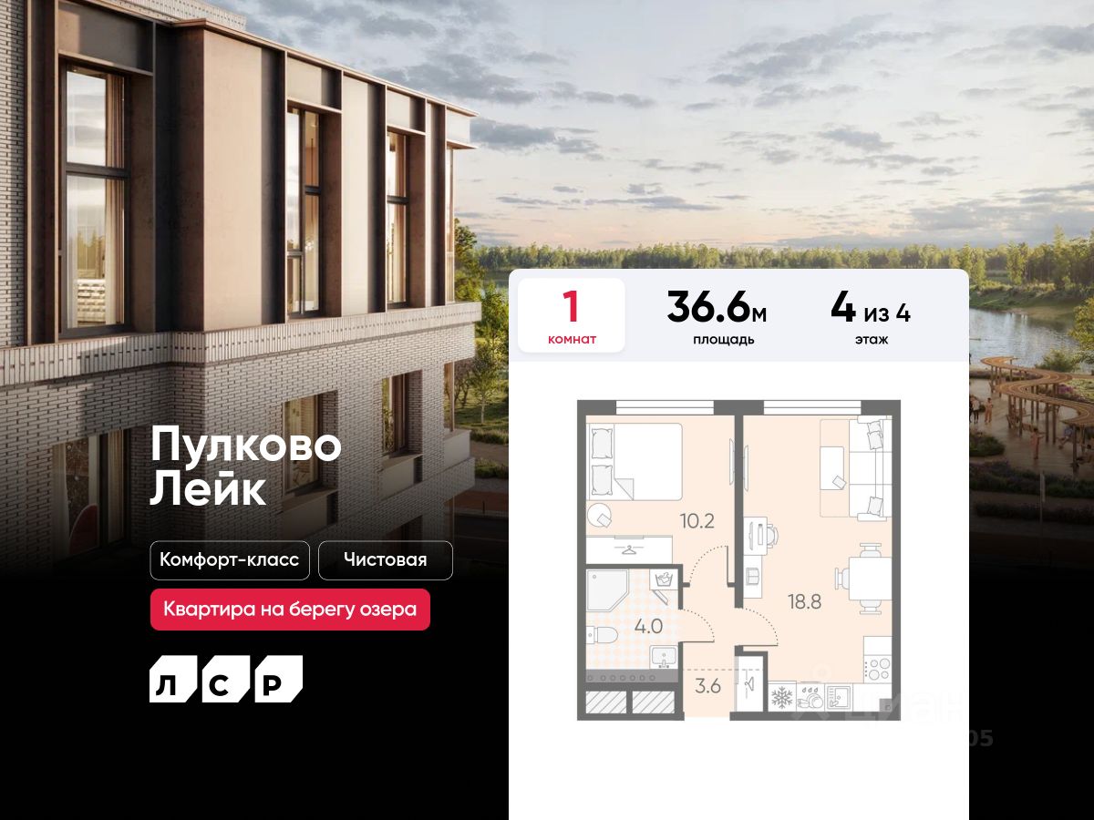 Продается 1-комнатная квартира в ЖК "Пулково Лейк" на 4 этаже. Общая площадь составляет 36.60 кв. м. Квартира с чистовой отделкой. Жилой комплекс "Пулково Лейк" располагается по адресу Санкт-Петербург, Московский.