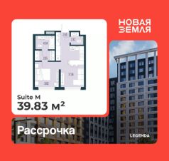 Продается 1-комн. квартира с предчистовой отделкой в ЖК "Новая Земля" на 2 этаже. Общая площадь: 39.83 кв.м., жилая: 9.82 кв.м., площадь просторной кухни-столовой: 17.35 кв.м. Все окна выходят на одну сторону. В квартире один совмещенный санузел. Высота потолков 2.85 м.