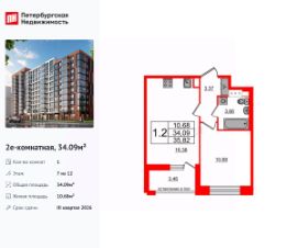 Удобная, классическая, функциональная европланировка, большая кухня-гостиная 16.38 м², вместительная прихожая 3.37 м². Общая площадь квартиры - 34.09 м², жилая 10.68 м², высота потолка 2.77 м.
