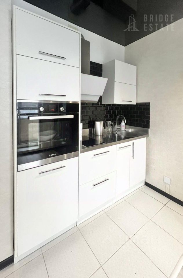на кухне - стилный глянцевый чёрный потолок, который визуально добавляет глубину и создаёт эффект "студийного пространства"