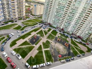 Окна выходят во двор. На 15-м этаже нет шума от площадок и машин - спокойный вид, много света и ощущение пространства.