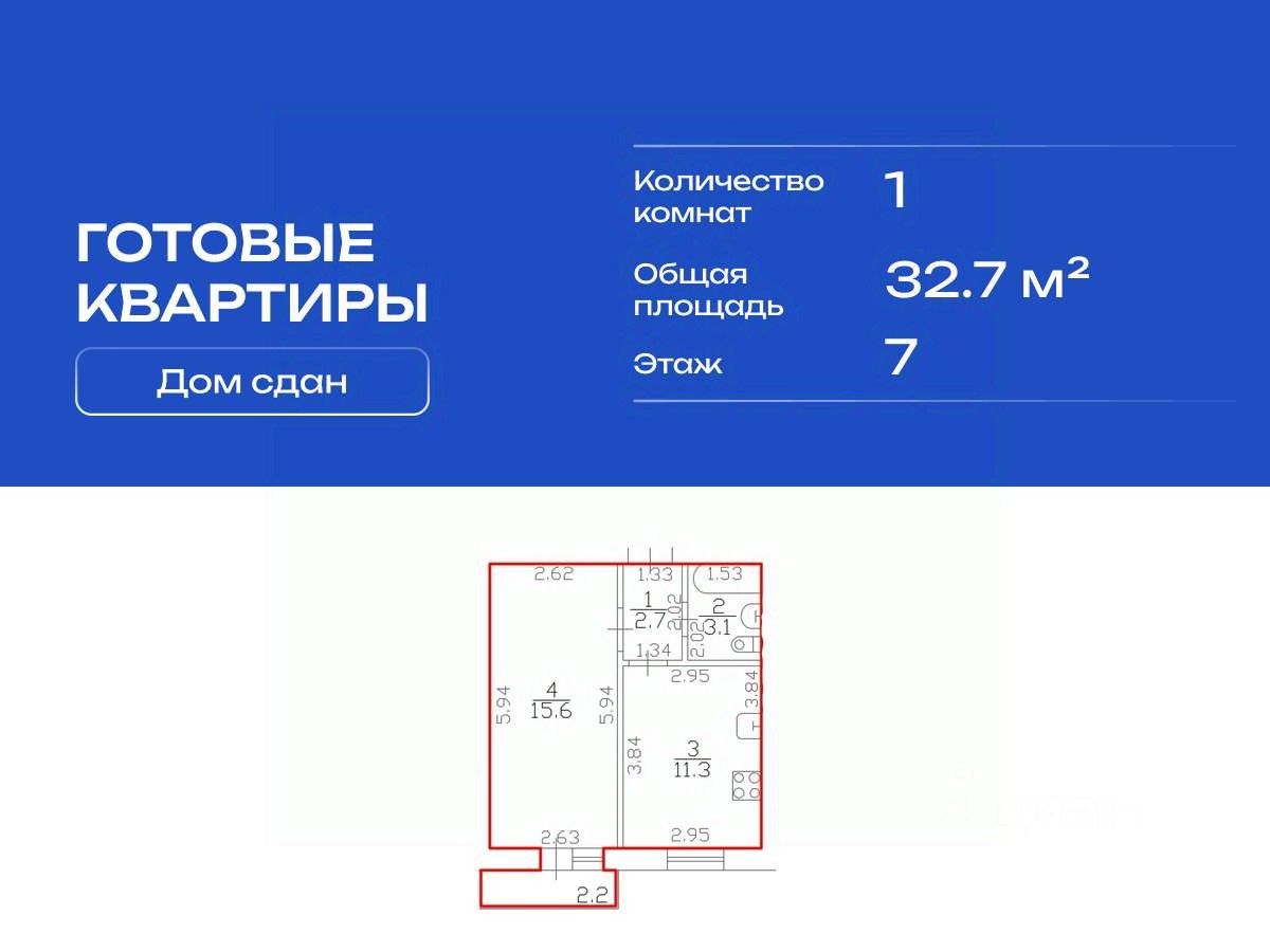 Продается квартира в сданном жилом комплексе на 7 этаже в девятиэтажном кирпичном доме. Общая площадь 32.70 кв. м.