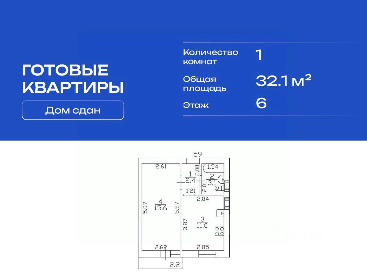 Продается квартира в сданном жилом комплексе на 6 этаже в девятиэтажном кирпичном доме. Общая площадь 32.10 кв. м.