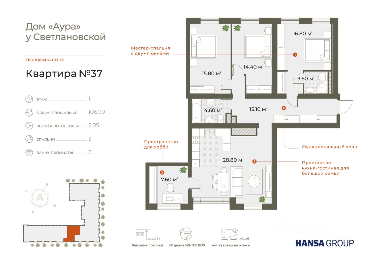 Квартира 106,7 м2 передается с отделкой White Box. Внутри Вас ждет: продуманная разводка электроснабжения, алюминиевые окна Alutech, радиаторы отопления Kermi. Установлена входная дверь со скрытыми петлями.