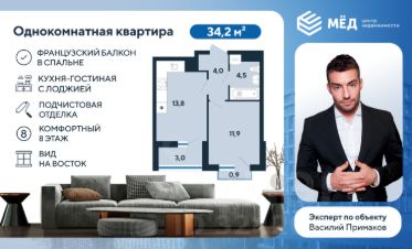- Общая площадь - 34,2 кв.м без учета лоджии