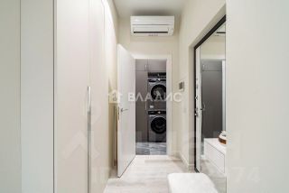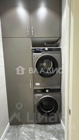 При входе в квартиру расположена полноценная постирочная, оборудованная встроенной мебелью с местами для хранения и комплектом стиральной и сушильной машины Sаmsung.