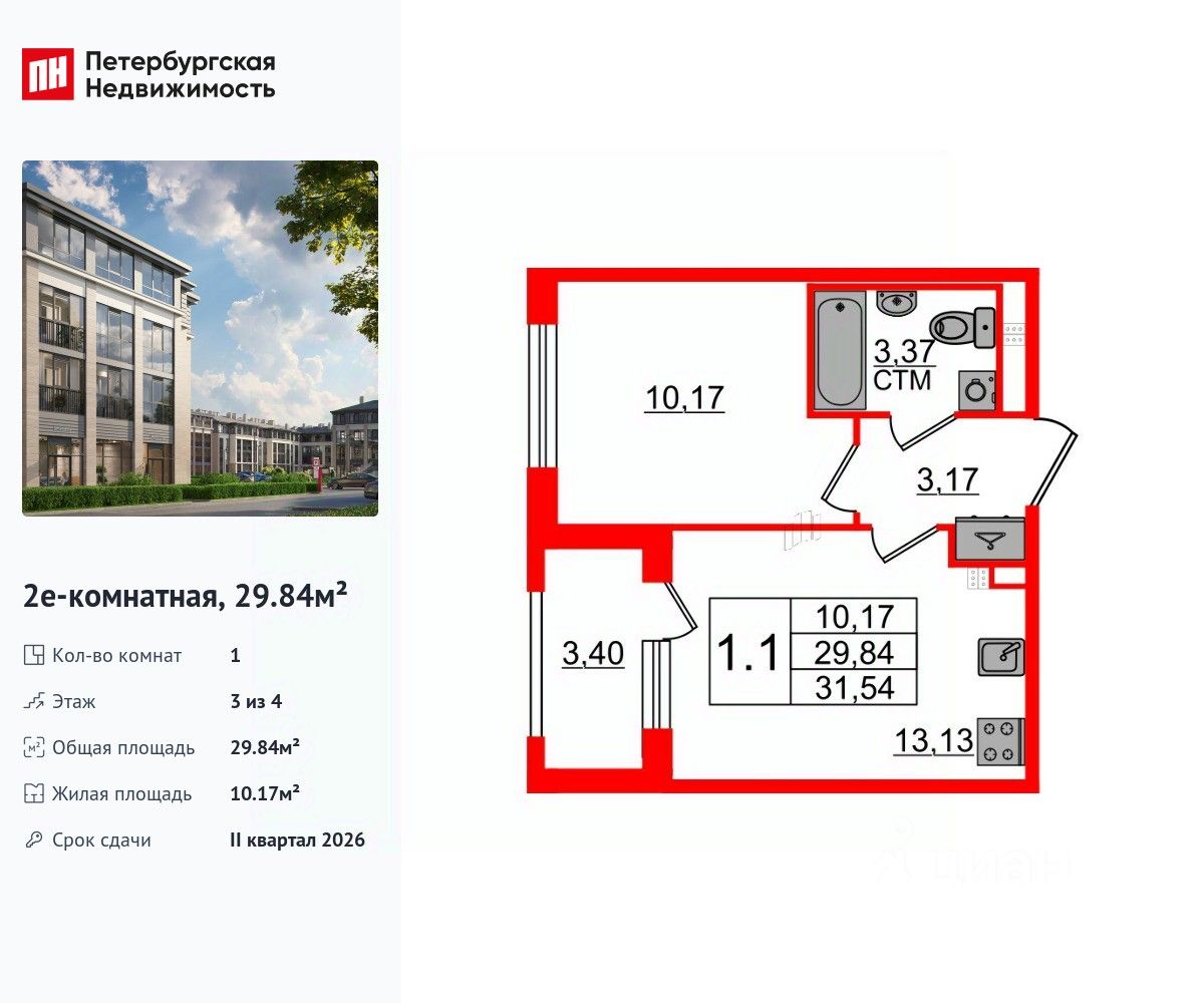 Удобная, классическая, функциональная европланировка, большая кухня-гостиная 13.13 м², вместительная прихожая 3.17 м². Общая площадь квартиры - 29.84 м², жилая 10.17 м², высота потолка 3 м.