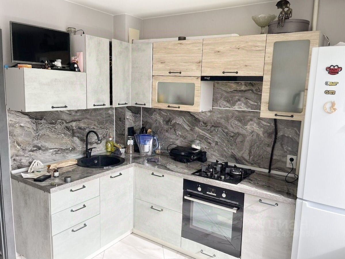 В подарок новым владельцам остаётся стильный и функциональный кухонный гарнитур и холодильник.