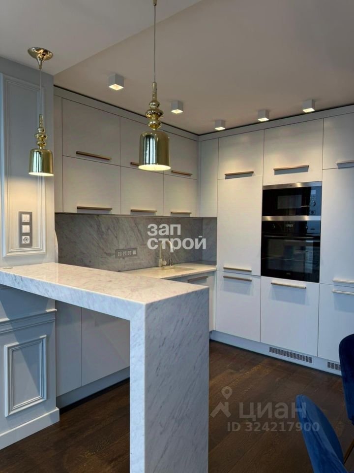 На кухне столешница, фартук и барная стойка из мрамора calacatta.