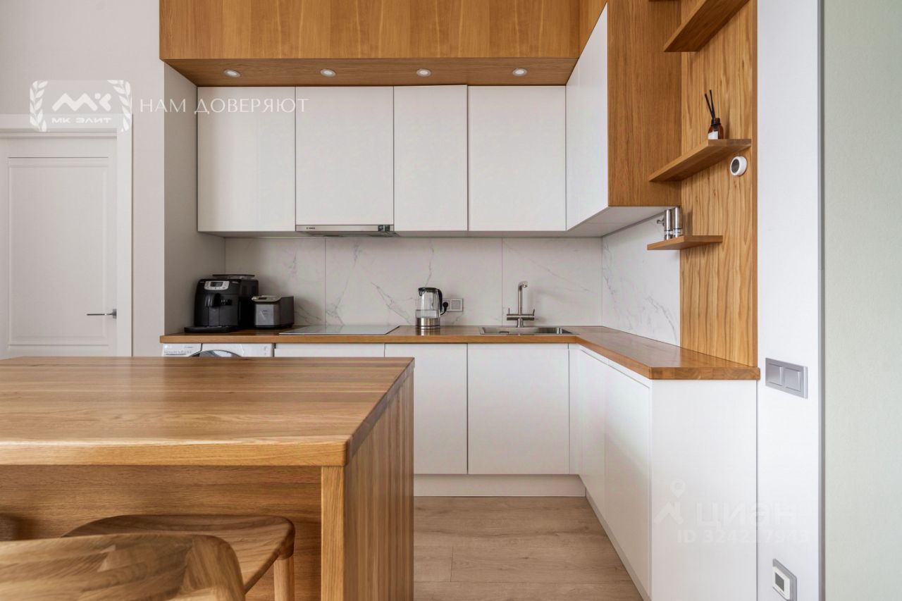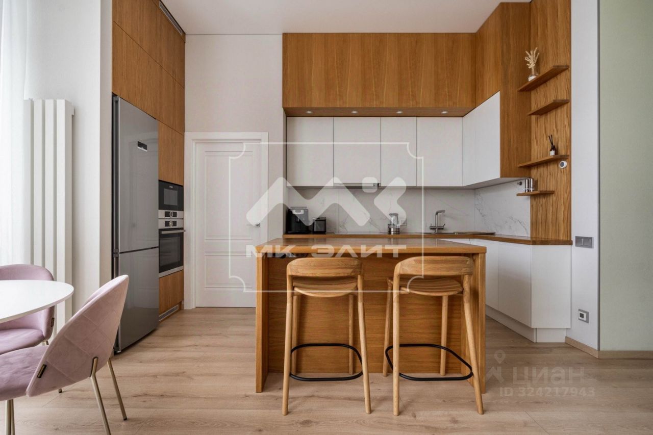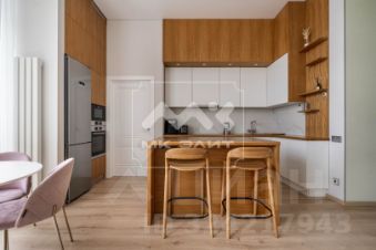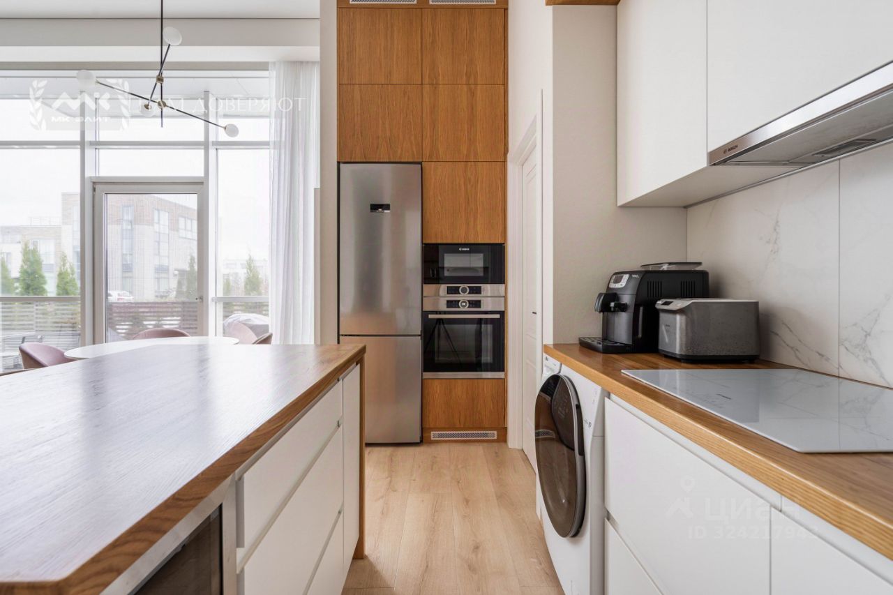 На кухне расположен остров из массива дуба, современная кухонная техника для проживания с минимальной амортизацией, а также винный холодильник.