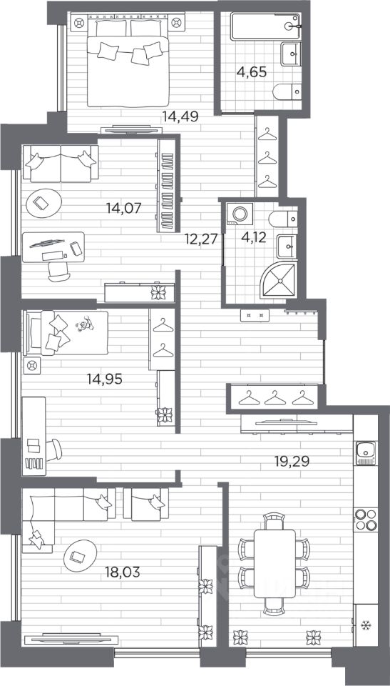 Продаётся 4-комнатная квартира в строящемся доме (1 этап), срок сдачи: III-кв. 2028, общей площадью 101.87 кв.м., на 4 этаже. Новый жилой комплекс "Галерная гавань" от застройщика "Самолет" расположен по адресу: Россия, Санкт-Петербург, территория Галерный Остров
