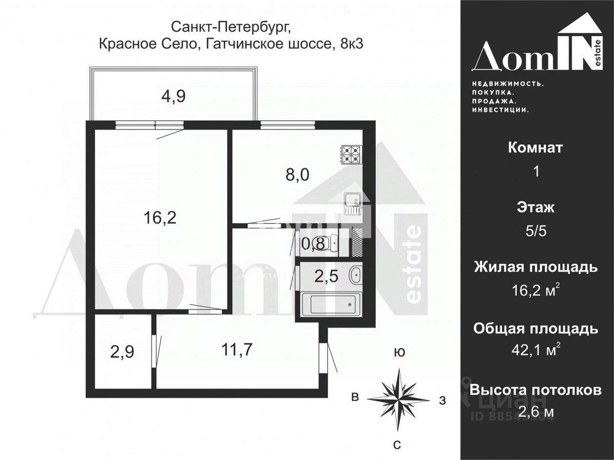 Общая площадь 42,1 м2 без учёта балкона.