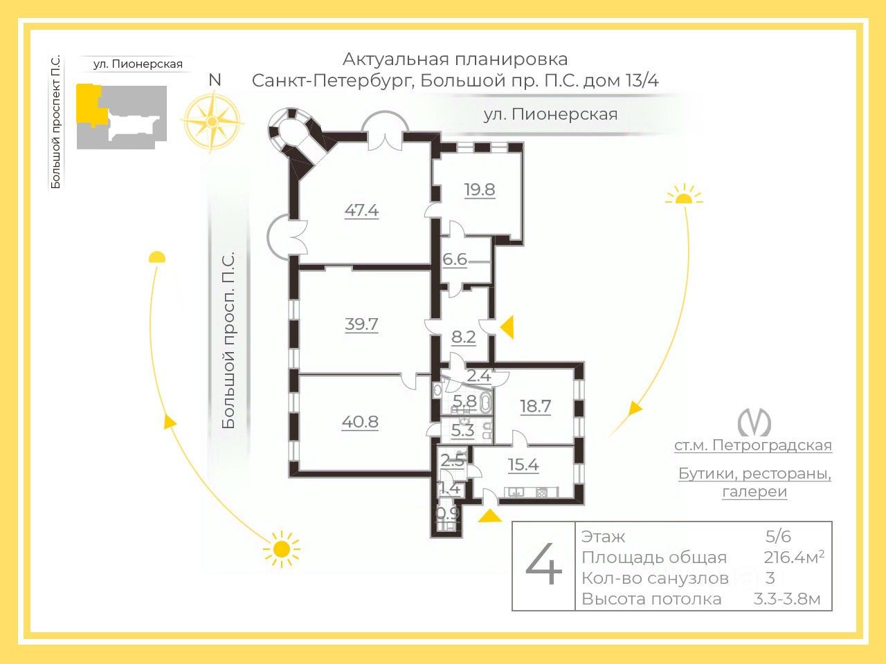 Квартира находится в историческом Петроградском районе Санкт-Петербурга, она прекрасно подойдет для проживания одной семьи , двух семей, так и для бизнеса, так как ее можно разделить на две полноценный квартиры!