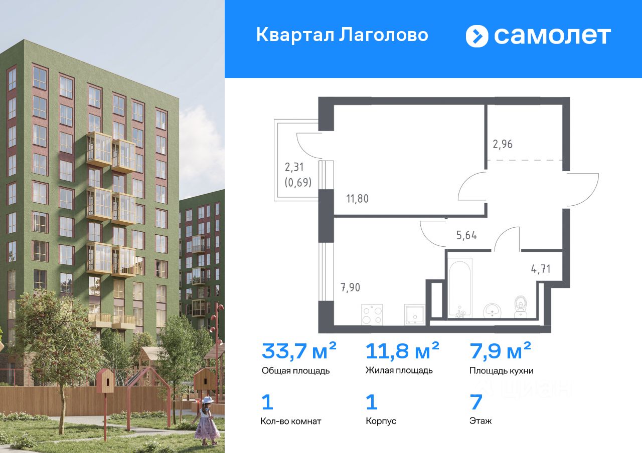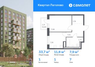 Строим кварталы для жизни с заботой о будущем. Предлагается 1-комнатная квартира комфорт-класса 33,7 кв.м в корпусе 1 на 7 этаже, в ЖК "Квартал Лаголово"
