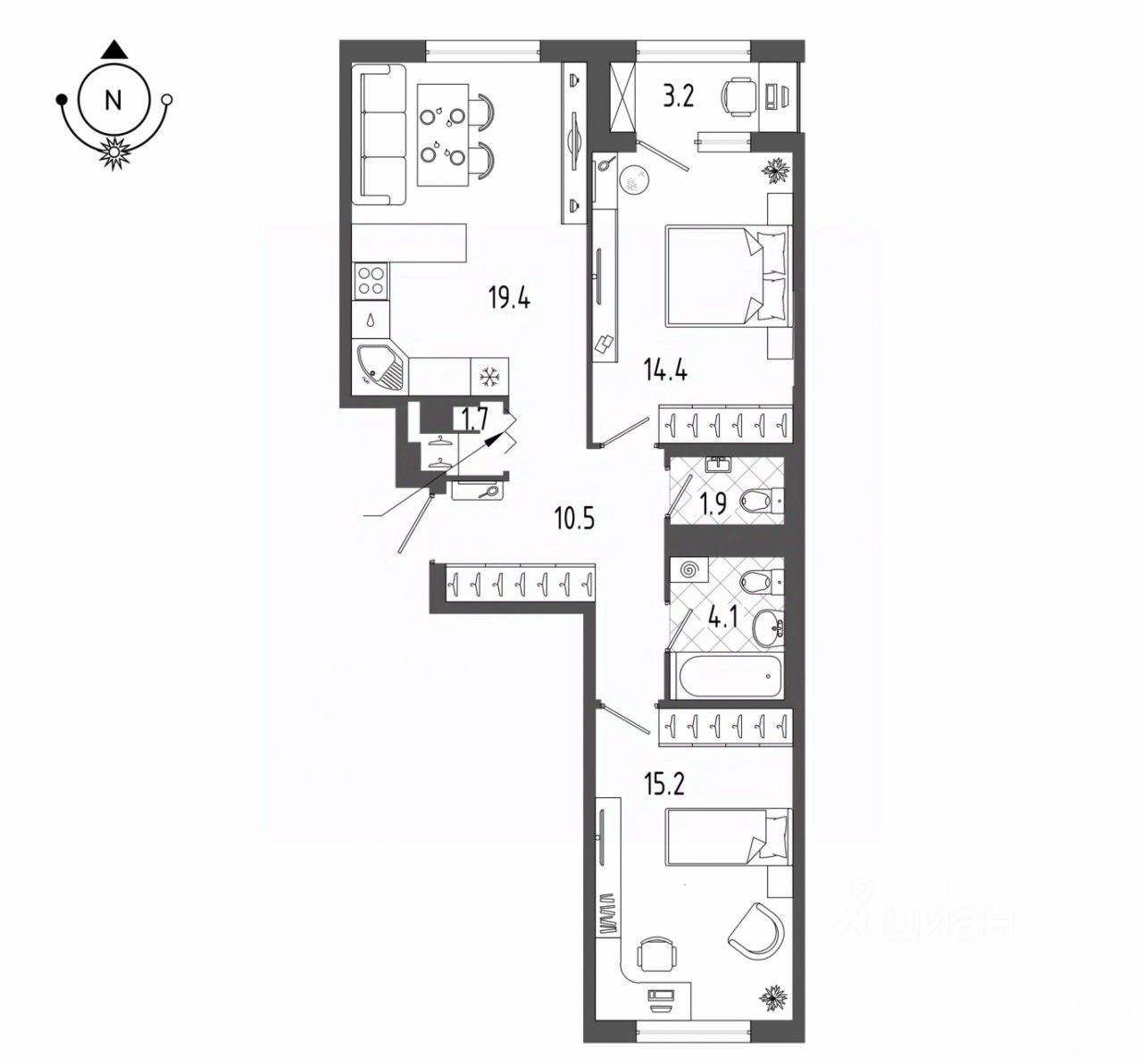-Комната 14,4+15,2 м2; - Ванная комната 4,1м2.; -Туалет 1,9 м2.;- Прихожая 10,5 м2.