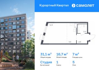 Строим кварталы для жизни с заботой о будущем. Предлагается квартира студия комфорт-класса 31,1 кв.м в корпусе 1 на 5 этаже, в ЖК "Курортный Квартал"