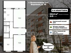 в квартире три изолированные спальни (16,2м + 12м + 9м)