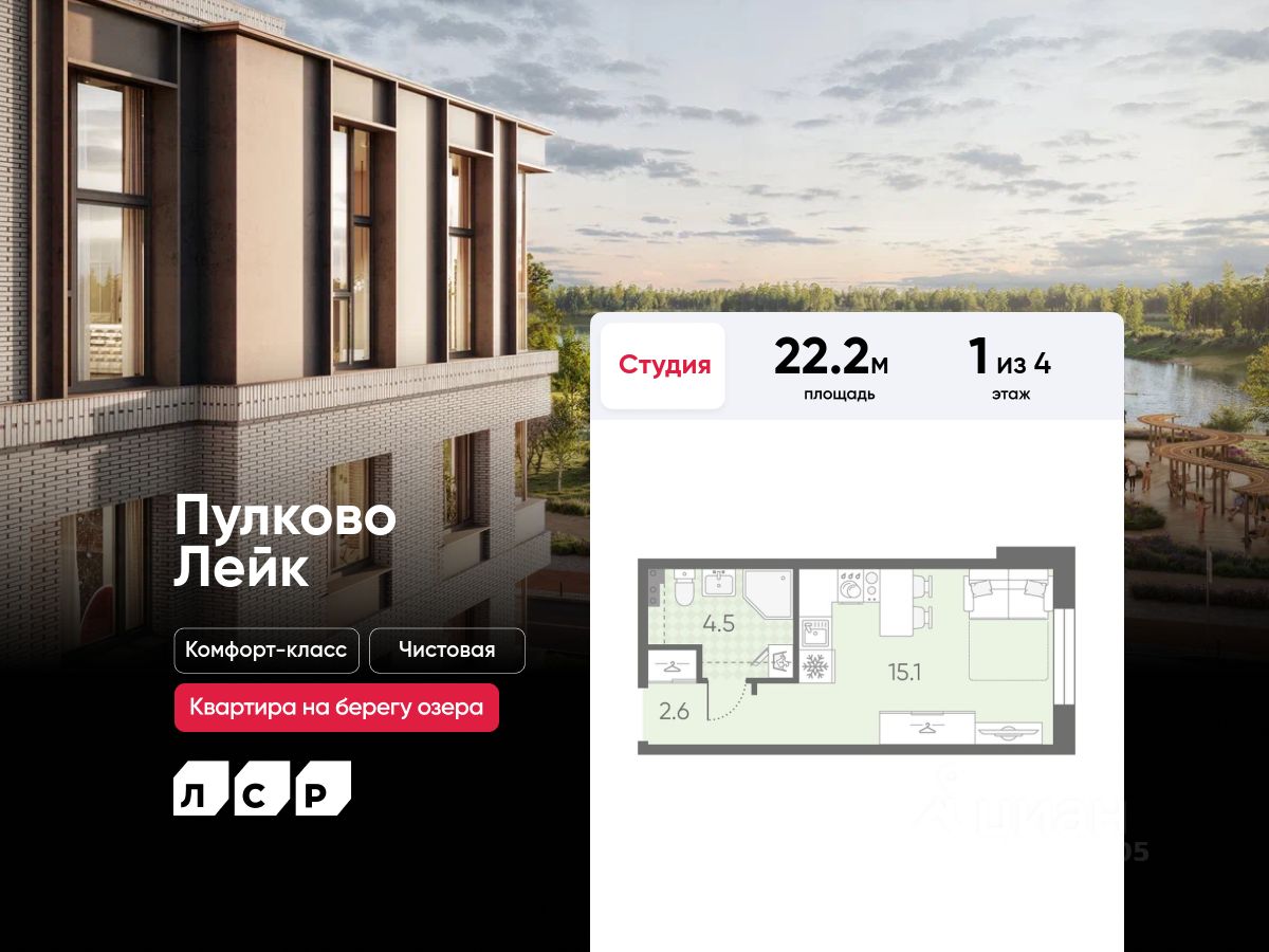 Продается студия в ЖК "Пулково Лейк" на 1 этаже. Общая площадь составляет 22.20 кв. м. Квартира с чистовой отделкой. Жилой комплекс "Пулково Лейк" располагается по адресу Санкт-Петербург, Московский.