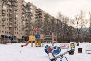 Во дворе детский сад и школа, большая детская площадка и стадион.