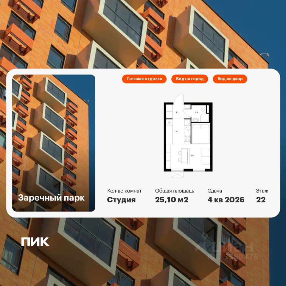 Продаётся квартира-студия площадью 25,1 кв.м на 22 этаже 24 этажного дома (Корпус 6, Секция 2) проекта ПИК Заречный парк. Светлый просторный подъезд на уровне земли, функциональная планировка, большие окна, c отделкой.