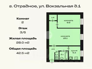 Предлагаем к покупке 2-х комнатную квартиру площадью 42.5 кв.м. Расположена на 3-м этаже 5-этажного кирпичного дома. Квартира состоит из прихожей, смежных комнат 18,1 и 9,9 кв.м. со встроенным шкафом, кухни 5.3 кв.м, ванной и туалета.