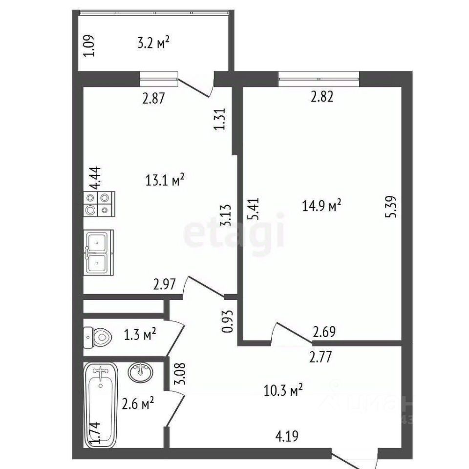 Площадь: 42,2 м²