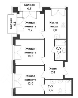 Планировка функциональная и удобная: прихожая с местом для гардеробного шкафа, три спальни, одна из которых — мастер-спальня с просторным санузлом, светлая кухня, совмещенный санузел и два видовых балкона (в одной из спален). Высота потолков — 3 м. Все окна панорамные, что наполняет квартиру светом и создает ощущение простора.