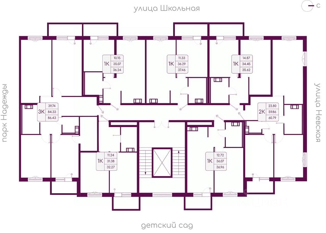 Жилая площадь 39.74 м2, кухня 18.16 м2. Площадь комнат: 11.39/12.37/15.98 м2, квартира без отделки, балконов - 2, окна выходят во двор и на улицу.