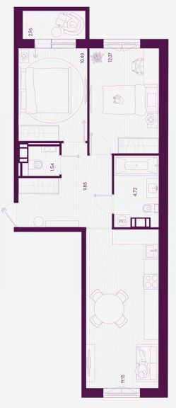 Жилая площадь 22.47 м2, кухня 19.15 м2. Площадь комнат: 10.4/12.07 м2, квартира без отделки, балконов - 1, окна выходят во двор и на улицу.