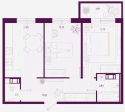 Жилая площадь 24.49 м2, кухня 12.9 м2. Площадь комнат: 12.19/12.3 м2, квартира без отделки, балконов - 1, окна выходят на улицу.