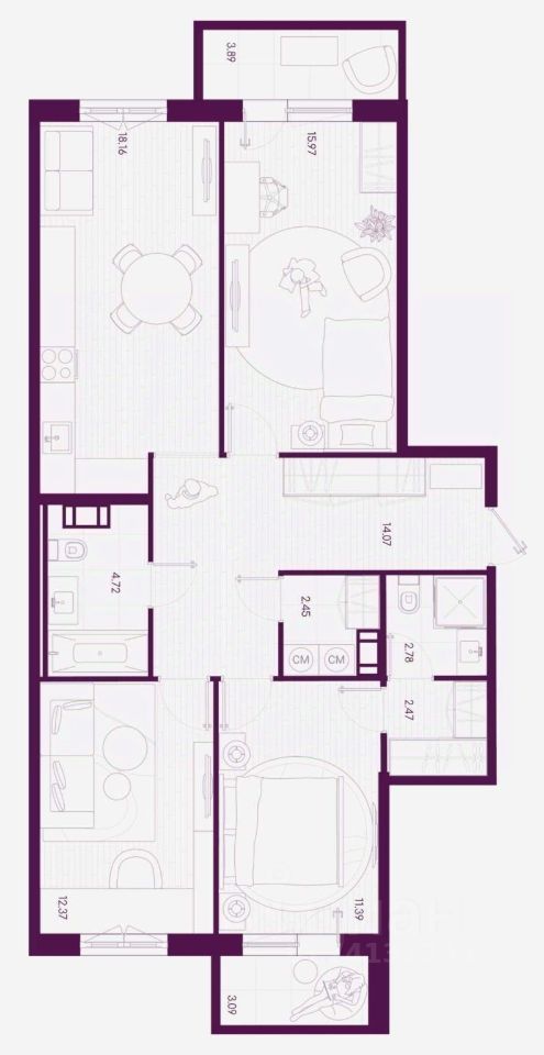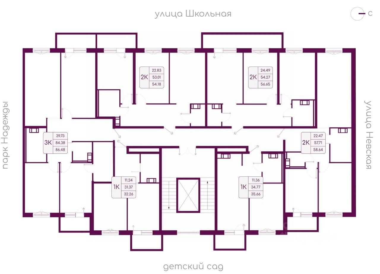 Жилая площадь 39.73 м2, кухня 18.16 м2. Площадь комнат: 11.39/12.37/15.97 м2, квартира без отделки, балконов - 1, окна выходят во двор и на улицу.