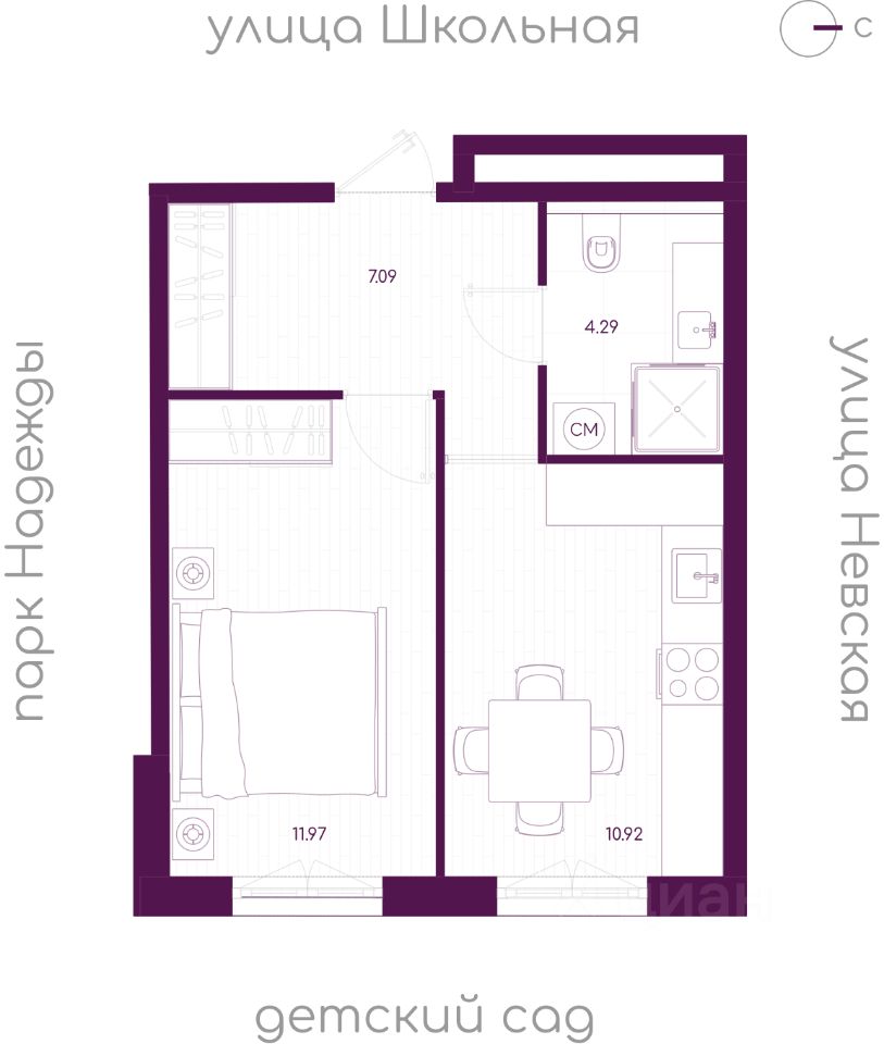 Жилая площадь 11.97 м2, кухня 10.92 м2, квартира без отделки, балконов - нет, окна выходят во двор.