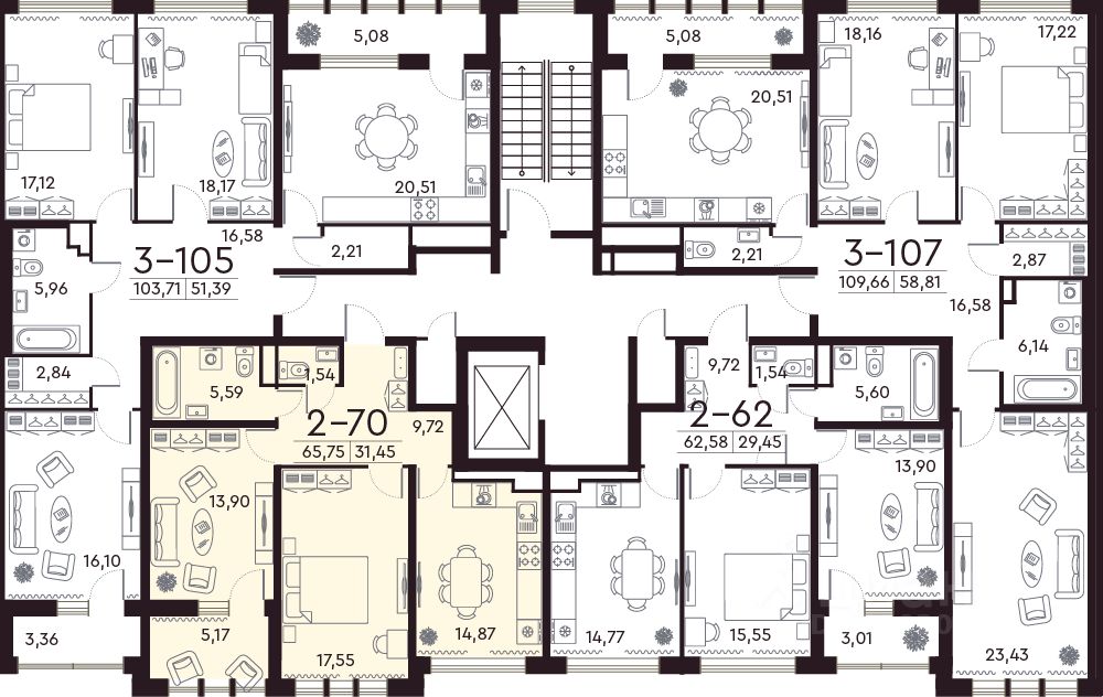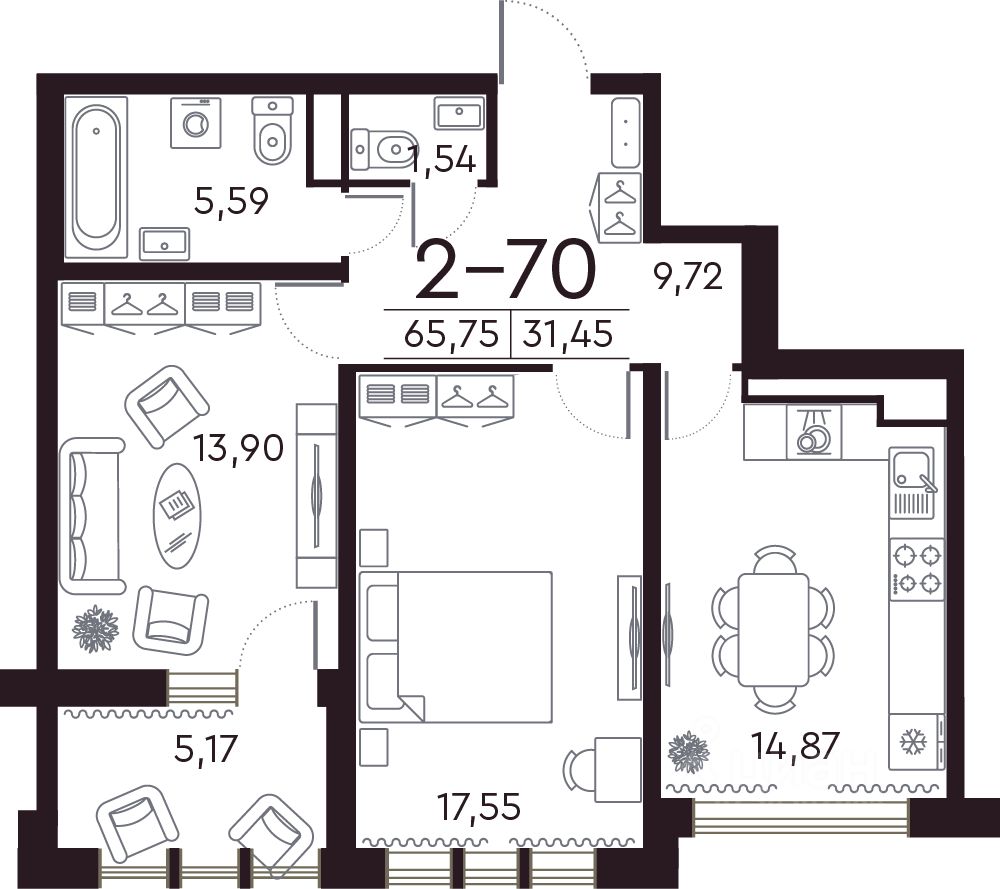 Квартира находится в 8 этажном доме, в Дом 3 на 8 этаже. Общая площадь квартиры 66,00 кв.м.