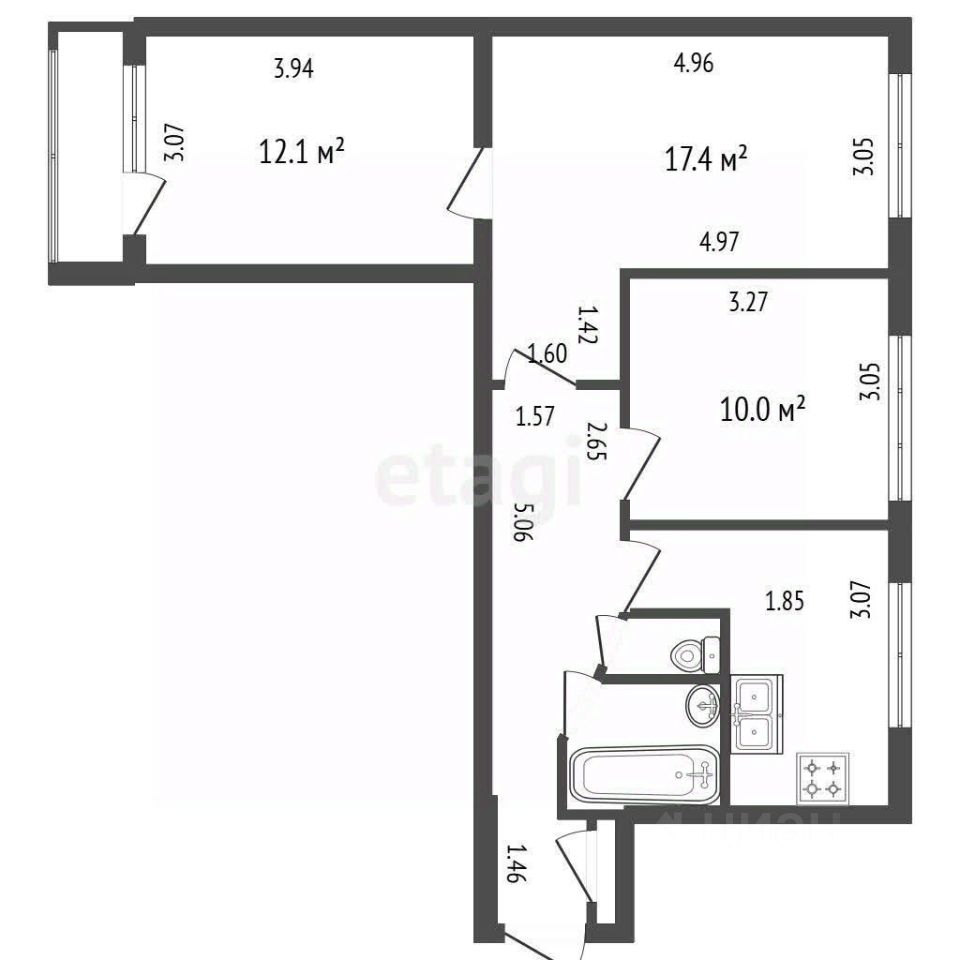 3 просторных комнаты 17.4 кв.м., 13.8 и 10.0 кв.м. дают возможность заселиться семье с детьми.