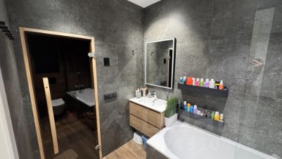 В квартире сделан качественный евроремонт, что позволяет сразу заехать и жить без дополнительных вложений. Вся сантехника от oras и villeroy boch. В квартире есть сауна из термодоски с финской печью iki (идеальна после катания на склонах). В квартире спальня 15 кв.м и детская 10 кв. м, большая кухня-гостиная 32 кв. м создают комфортное пространство для жизни. Окна выходят как на улицу, так и во двор с видом на холмы заказника, поэтому в квартире всегда светло, а значит уютно. В квартире есть два санузла, а также лоджия, где можно обустроить зону отдыха. Также в стоимость входит большая кладовая, расположенная в цокольном этаже дома.