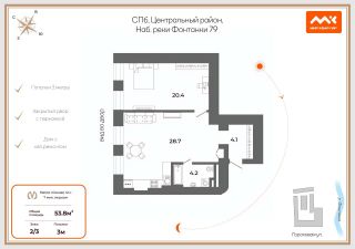 Общая площадь 56 метров: просторная кухня-гостиная в 2 окна и большая спальня также в 2 окна, совмещенный санузел с ванной, отдельная прихожая со встроенными шкафами, мебель, кухня, техника- все остается.