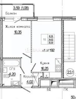 Общая площадь квартиры составляет 35,9 кв. м, жилая — 10,35 кв. м, площадь кухни — 16,25 кв. м. Изолированные комнаты и балкон создают комфортные условия для жизни. Окна выходят на улицу, а расположение квартиры обеспечивает отличное естественное освещение.