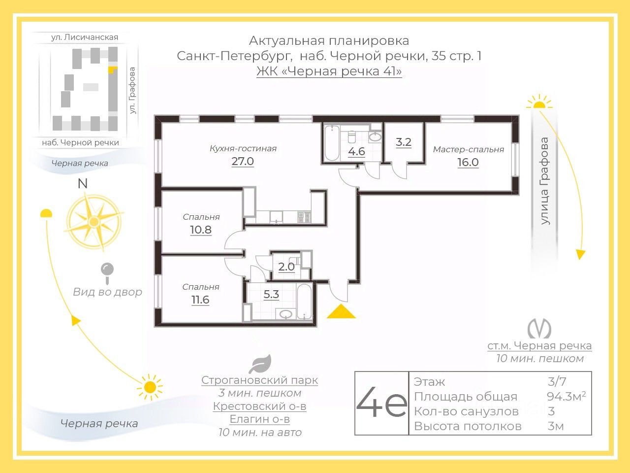 Планировка включает в себя кухню-гостиную (27м²) с 4 окнами, хозяйскую мастер-спальню (16м²) со своим с/у (4,6м²) и гардеробной (3,2м²), две детские с окнами в тихий внутренний двор (11,6м² и 10,8м²), а также еще 2 с/у.