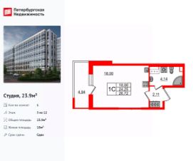 Удобная, классическая, функциональная европланировка, вместительная прихожая 2.11 м². Общая площадь студии - 23.9 м², жилая 18 м², высота потолка 2.77 м.