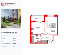 Удобная, классическая планировка, кухня 10.64 м², просторная прихожая 5.1 м². Общая площадь квартиры - 33.7 м², жилая 14.48 м², высота потолка 2.77 м.