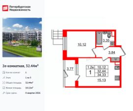Удобная, классическая, функциональная европланировка, большая кухня-гостиная 15.13 м², вместительная прихожая 3.84 м². Общая площадь квартиры - 32.44 м², жилая 10.12 м², высота потолка 2.77 м.