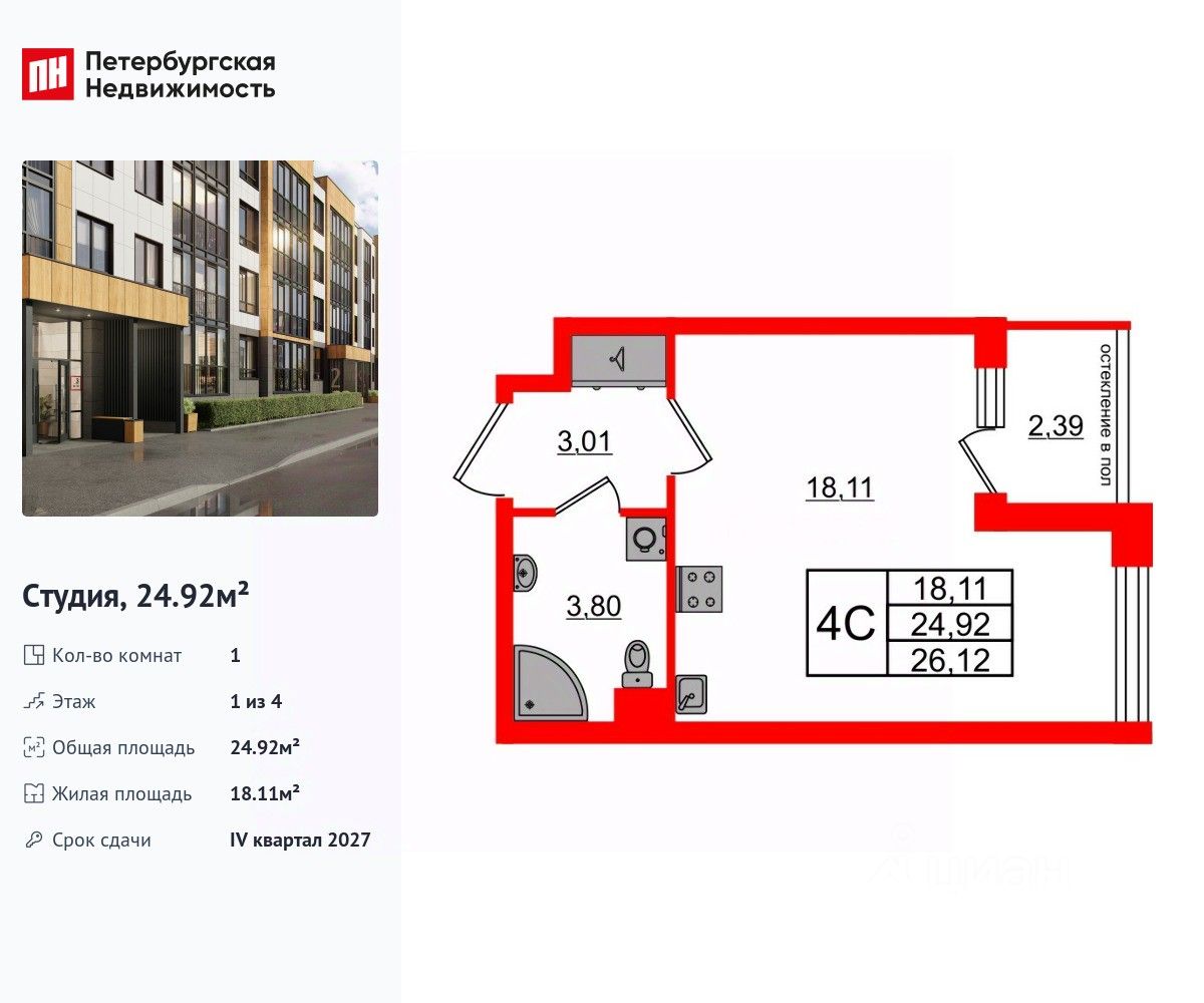 Продается просторная студия от застройщика в жилом комплексе "Univer City" в на юге Санкт-Петербурга.