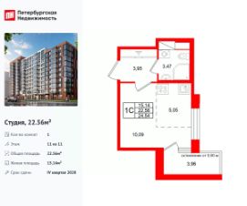 Удобная, классическая, функциональная европланировка, просторная прихожая 3.95 м². Общая площадь студии - 22.56 м², жилая 15.14 м², высота потолка 3 м.