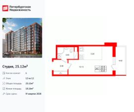 Удобная, классическая, функциональная европланировка, просторная прихожая 3.46 м². Общая площадь студии - 25.12 м², жилая 18.16 м², высота потолка 3 м.