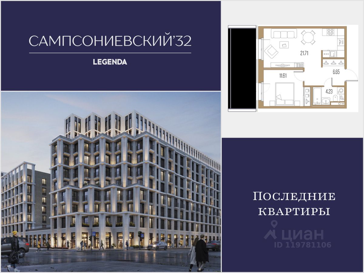 Квартира с одной спальней в комплексе "Сампсониевский 32" от LEGENDA на 1 этаже.