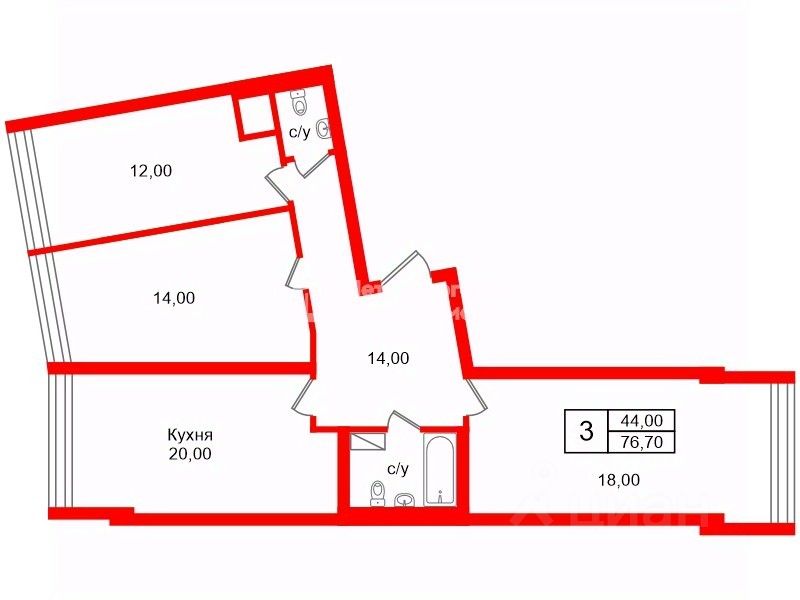 Общая площадь квартиры 76.7м2. Площадь кухни 20 м2, комнаты 14м2, 18м2 и 12м2, все изолированы друг от друга просторным коридором 14м2. Окна двух комнат и кухни выходят на Неву. Покупателю готовы оставить весь кухонный гарнитур вместе с техникой.